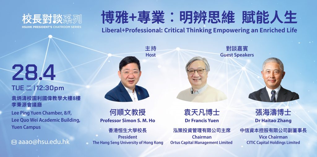 Drawing on the “Liberal + Professional” education concept, Professor Simon S. M. Ho, President of The Hang Seng University of Hong Kong (HSUHK), will be joined by Dr Francis Yuen, Chairman of Ortus Capital Management Limited and Adjunct Professor of HSUHK, and Dr Haitao Zhang, Vice Chairman of CITIC Capital Holdings Limited, will explore and share their insights on how this concept can support young people’s personal growth and the cultivation of a “liberal approach to life”, via developing core transferable competencies including curiosity, critical thinking, and creative problem solving, etc.